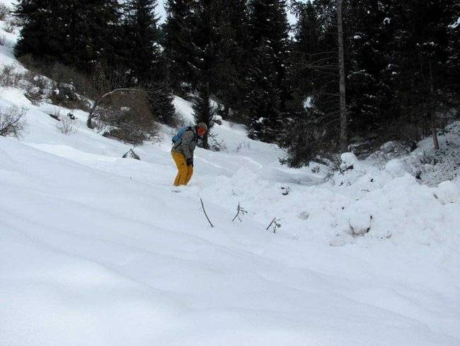 Снега было очень много, что не много затрудняло старт . Это была решаемая проблема,группа поднялась не много в верх , это дало разгон доскам и проскачив сложный участок , заехали в лес где начался настоящий freeride.