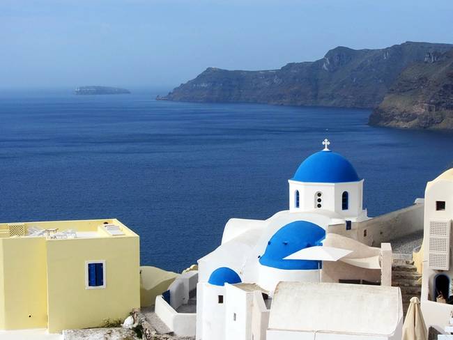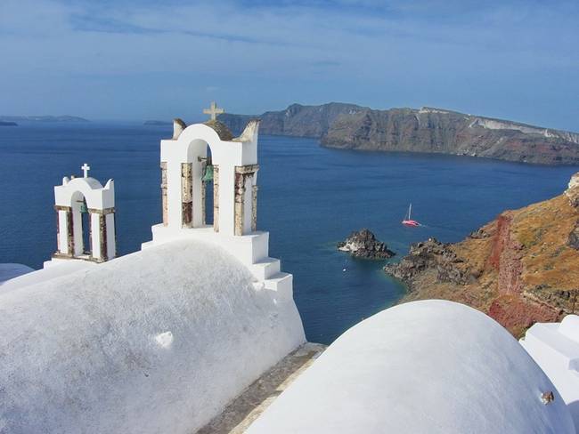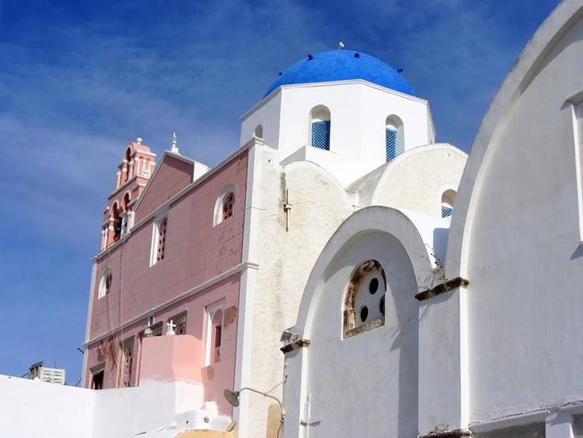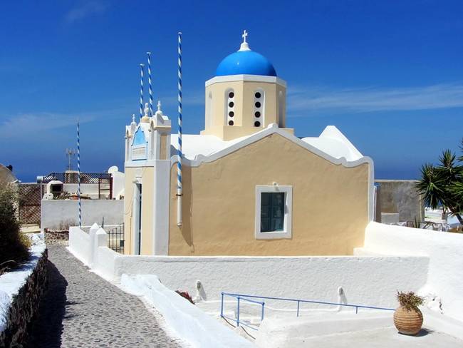 Чтобы увидеть самые известные "открыточные" виды Иа, надо свернуть с Мраморной улицы в малоприметный переулок в сторону моря и пройти несколько десятков метров. Вы выйдете к небольшой, "полуцилиндром" вытянутой в сторону моря церкви с двумя звонницами и потрясающими видами: