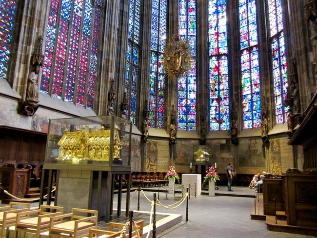 В конце 14 - начале 15 столетий к Дворцовой капелле были пристроены хоры - большой зал в готическом стиле с многочисленными вытянутыми окнами, делающими его похожим на огромный хрустальный ларец. Он был задуман для хранения саркофага Карла Великого и реликвий собора, привезённых сюда из Византии, Рима, Дамаска и Иерусалима, названных позже Евангельскими святынями Аахена (к ним относят одеяние Божьей Матери в ночь Рождества в Вифлееме, пелены Богомладенца Иисуса, окровавленную повязку Христа, бывшую на нём во время крестных страданий, плат, в который была завернута глава св. Иоанна Крестителя, и ещё 3 так называемые "малые святыни").