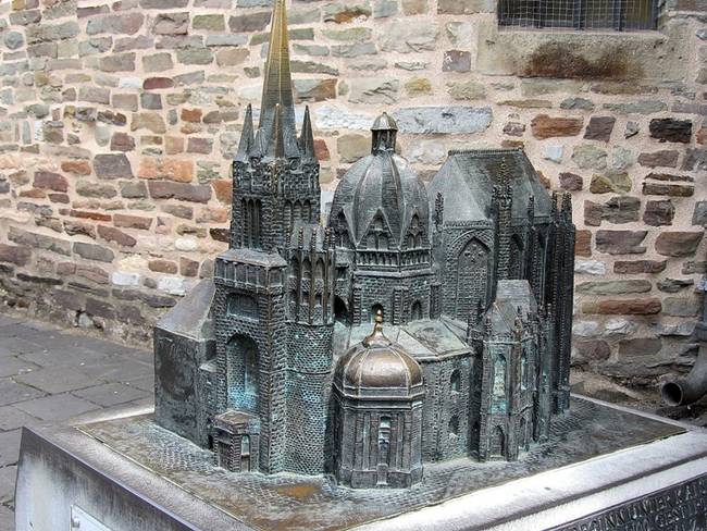 Королевская капелла - это симметричное в плане восьмигранное сооружение в виде башни с серым "складчатым" куполом, ставшее впоследствии архитектурным центром аахенского собора. Уже значительно позже, когда собор начал расширяться, к ней с разных сторон были пристроены хоры и новые капеллы, в основном - в готическом стиле. Как часто это бывает, наилучшее представление о структуре всего сооружения в целом даёт его макет, установленный рядом: