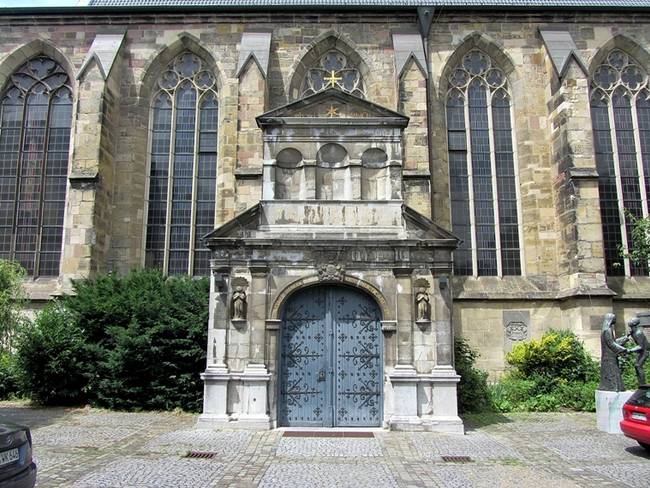 Прекрасный готический портал на мрачноватом с виду серо-коричневом здании открывает вход в Сокровищницу аахенского собора.