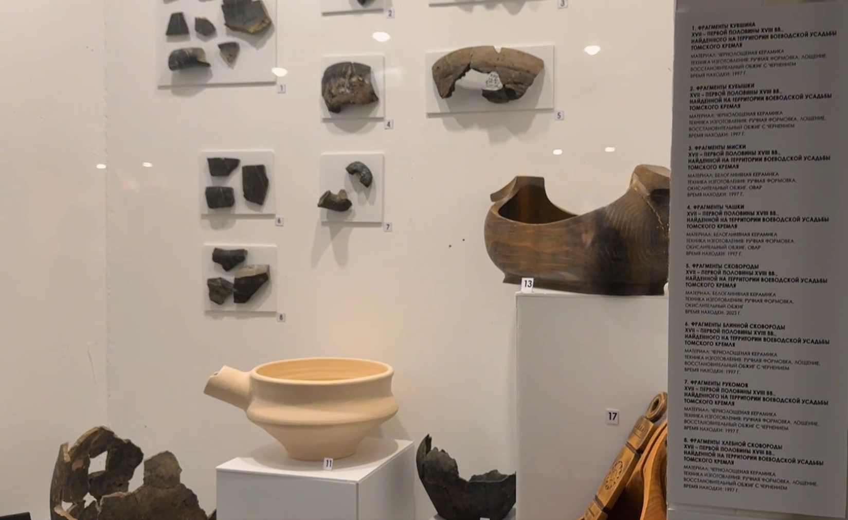В экспозиции представлены как артефакты из археологических раскопок на Воскресенской горе, так и реконструкции костюма, предметов быта, делопроизводства.