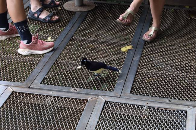 На обратном пути по мосткам нам попались симпатичные чёрные бабочки с синими пятнышками, а ещё голубая хохлатая ворона - любопытная птичка, размером и формой тела похожая на сороку, в основном чёрная, но с белым животом, голубыми “бровями” и хохолком на голове.