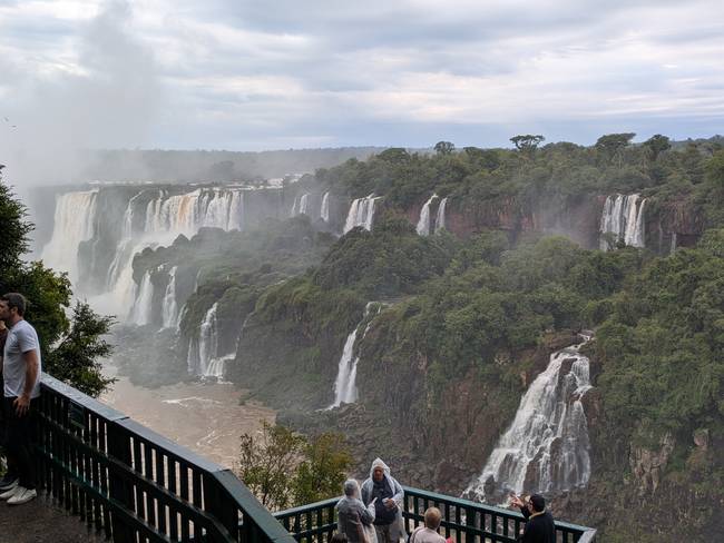 До водопадов автобус идёт минут сорок. От конечной станции нужно идти ещё минут пять, и постепенно начинают открываться великолепные виды. Всё поле зрения слева направо представляло собой восхитительную картину: десятки маленьких и гигантских водопадов в обрамлении ярко-зелёных джунглей.