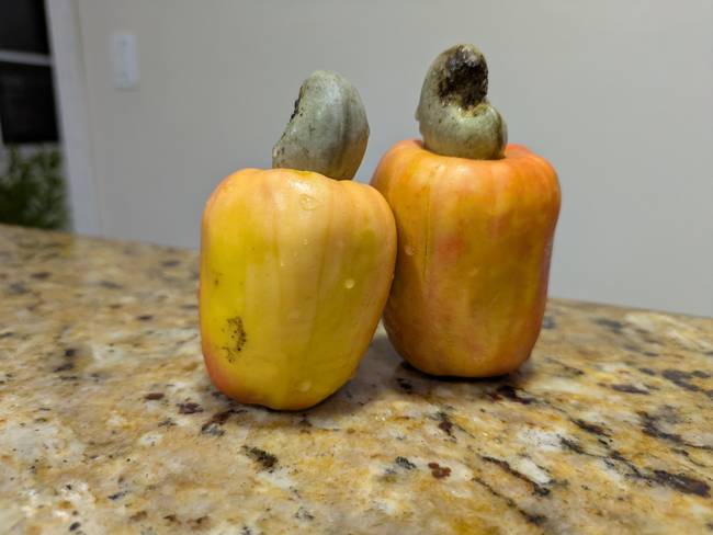 Так вот, только мы пришли домой, как хлынул страшный ливень. Мы поужинали, выпили игристое и решили разобраться с новым для нас фруктом. Внешне плод ореха кешью напоминает болгарский перец или паприку: красный или оранжевый “стручок” с серо-зелёной пимпочкой. Вот только плод внутри не полый, а цельный и заполнен кисловато-сладким соком. А “пимпочка” - это не плодоножка, а собственно орех в скорлупе.