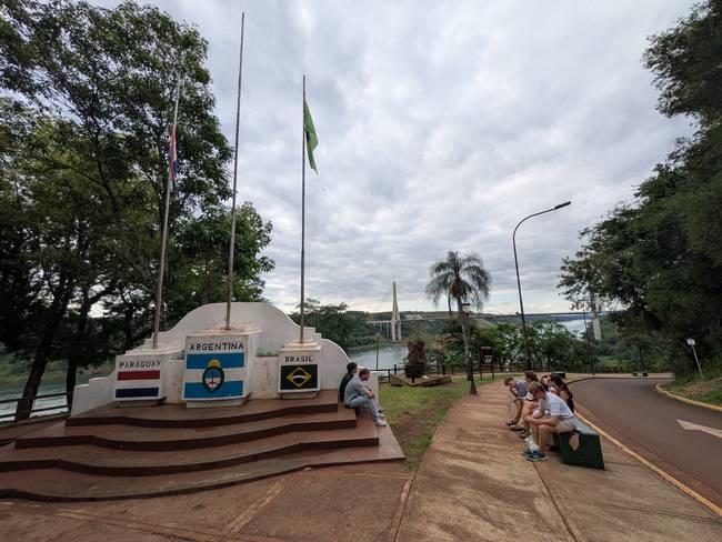 Двадцать пять минут пешком, и мы у цели. Посмотрели с возвышенности на Бразилию, на Парагвай, на коричневую Игуасу и на сине-зелёную Парану; посмотрели на стеллу, увековечивавшую эту точку, и на три флагштока рядом (причем флаги Бразилии и Парагвая висят, а аргентинский, похоже, кто-то стырил).