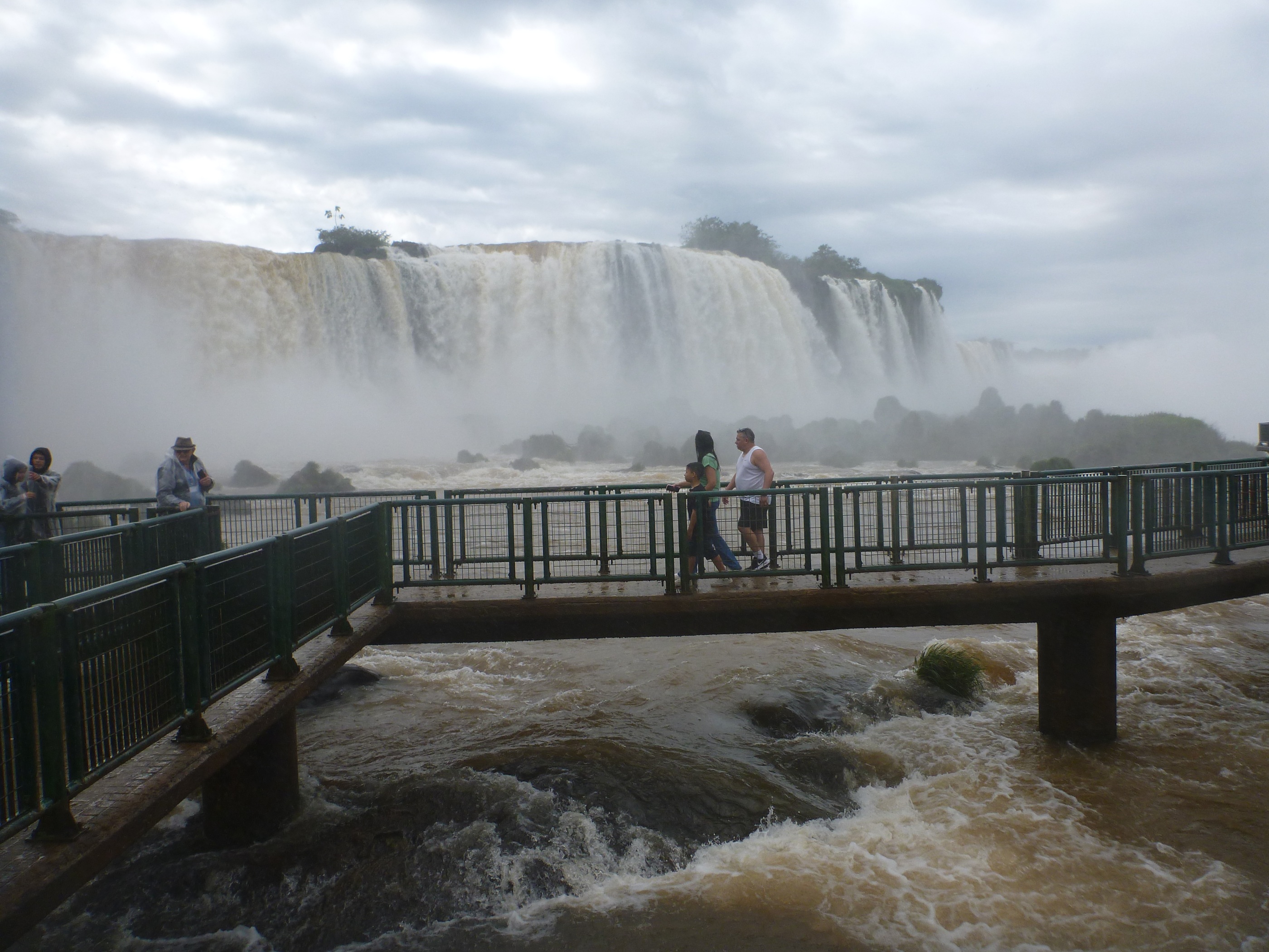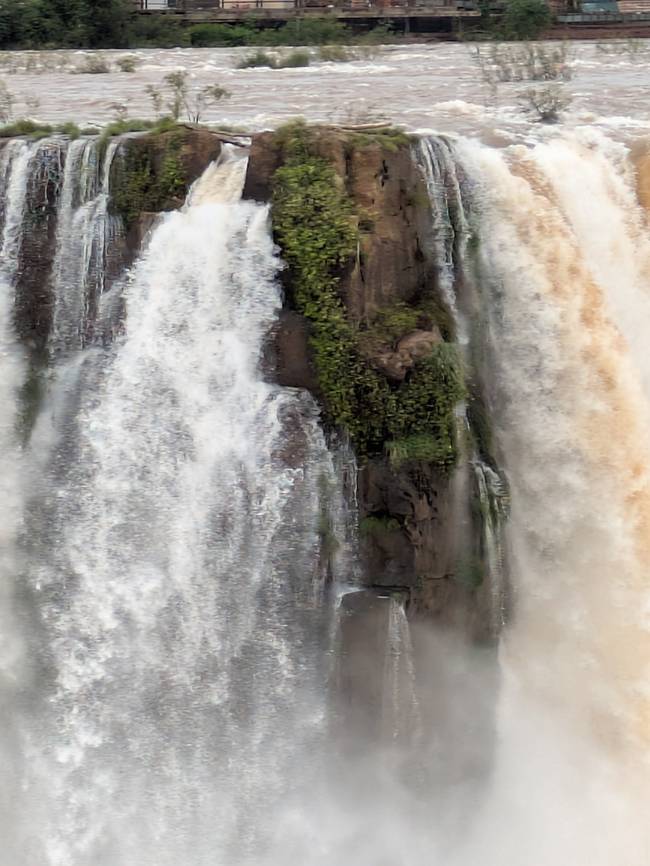 В этом месте мы натянули на себя водозащитные одеяния. Одноразовые полиэтиленовые плащи можно купить и на месте, но они вряд ли спасут от среды, где непонятно чего больше - воздуха или воды. Те, кто решил сэкономить, покидали мостик в таком состоянии, как будто они просто нырнули в воду. Естественно, обычные смартфоны и камеры использовать под таким потоком - полное безумие. Я на этот случай взял подводный фотоаппарат, но на нём снимки получились размытые, поскольку картинка искажалась каплями воды на объективе. Но бог с ними, со снимками. Главное, что мы практически искупались в водах одного из самых величественных водопадов мира.