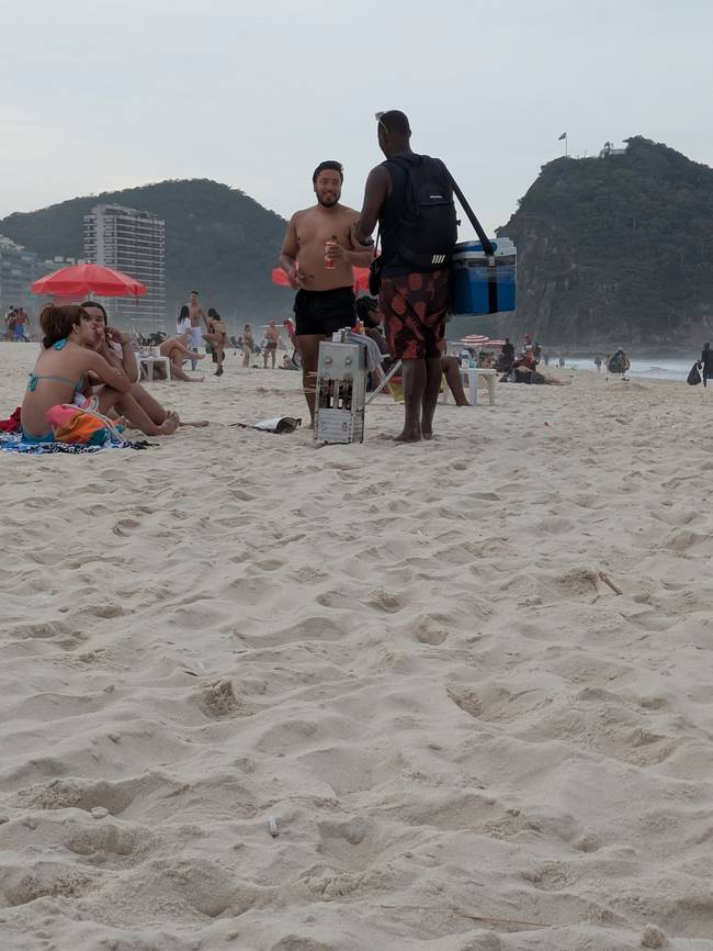 Некоторое время мы просто лежали на подстилке, наблюдая за жизнью вокруг. Народ на пляже в основном молодой и подтянутый. Неспортивных тел мало. Очень многие на пляже заняты игрой в футбол, волейбол и тот самый “футбольный волейбол”. Кто-то качается на тренажёрах, которых тут поставили довольно много. Пляж довольно чистый, но слабо оборудованный, если не считать спортплощадок и тренажёров: нет ни переодевалок, ни туалетов, ни душа. Разумеется, вдоль пляжа стоит множество заведений; в каждом втором играет живая бразильская музыка. Немного раздражает избыток пляжных торговцев. Предлагают очки, купальники, холодные напитки и горячую кукурузу, сувениры, полотенца, парео, тапочки и ещё массу безделушек. Простого “Não, obrigado!” им недостаточно. Они почему-то уверены, что это “Нет, спасибо” относится только к одному виду товара, а у каждого из них в наличии не меньше десятка. В результате, продавец садится рядом и начинает по очереди предлагать все пункты из своей номенклатуры. Нет, они вполне доброжелательные и вежливые, и убедившись, что ни один из дюжины их товаров тебя не заинтерсовал, говорят “спасибо” и желают хорошего дня… Через пару минут подходит новый…