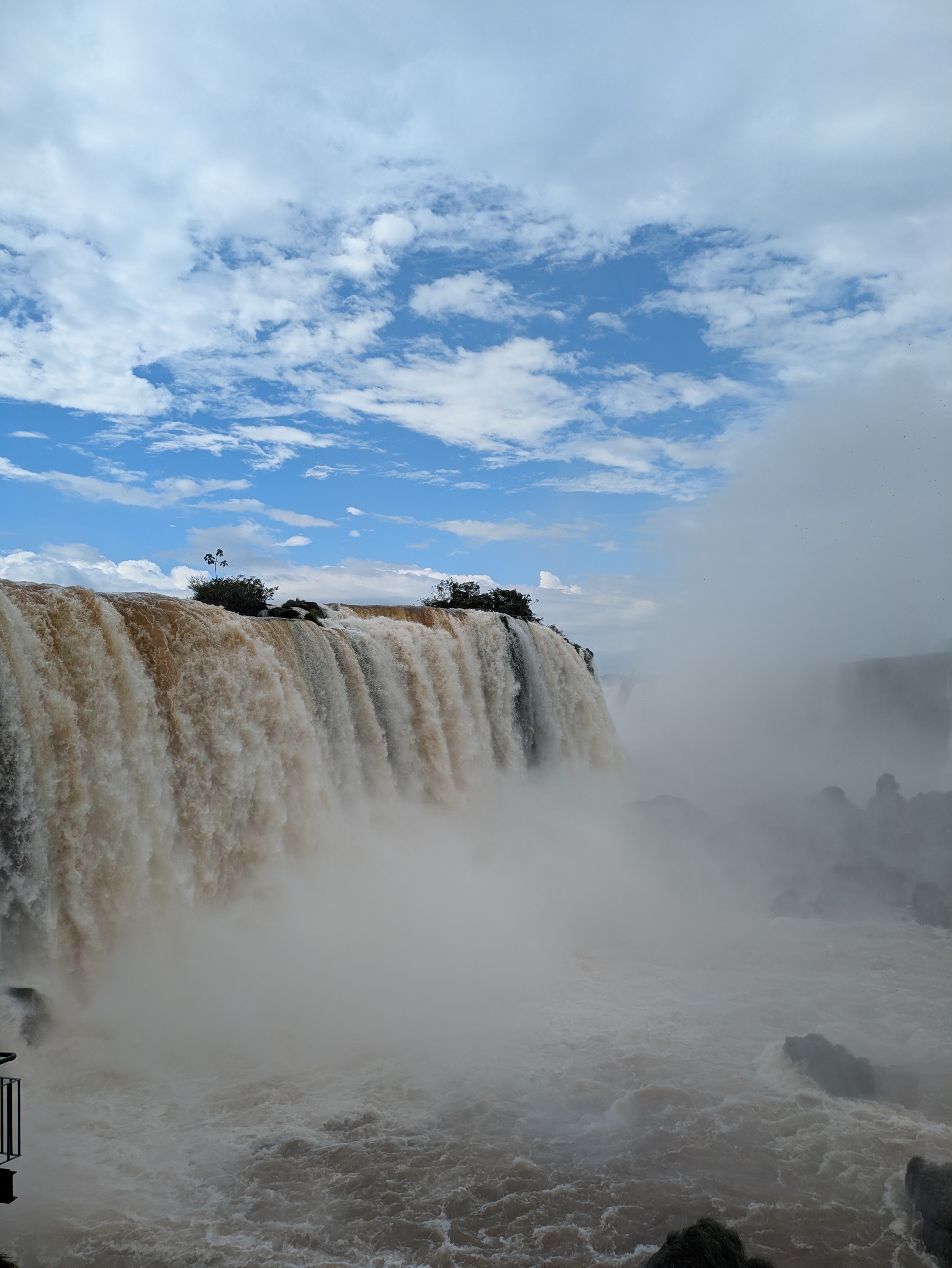 Ощущения отличаются от вчерашних. Вчера мы наблюдали красивый пейзаж с падающей водой. Сегодня это адская кухня. В нескольких метров от вас в пропасть проваливаются тысячи тонн воды в каждую секунду. Из-за тумана от брызг внизу ничего не видно, грохот стоит ужасный, а сам туман периодически резко поднимается на десятки метров вверх над водопадом, как гейзер. Зрелище бурлящей воды напомнило мне видеозаписи поверхности Солнца - такое же кипение, пузыри, пена… Вот только на Солнце нет каких-то чёрных птиц, которые тут спокойно порхают над туманом и почти под струями…